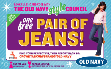 Remember my recent post about Crowdtap? Well they are at it again! This time with FREE Old Navy Jeans! This time for YOU AND a FRIEND! WaHoo! If you are a member hurry to your account and see if the offer is open to you! Not a member? There is still time! Just go HERE FREE to sign up!