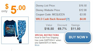 Right now ShopAtHome.com has yet another WILD deal! You can score Disney Cars PJ’s! Here’s how it works! Just visit ShopAtHome.com HERE and click the Buy Now Button! It will take you to the Disney website where you can purchase any Cars PJ’s at  $12.00! Then use coupon code MCQUEEN at checkout to get $3.00 off paying just $9.00! Then ShopAtHome.com will reimburse your ShopAtHome.com account $4.00 making your purchase just $5.00! When you ShopAtHome.com account reaches $20 they will send you a check! YAY!