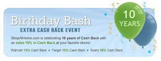 ShopAtHome.com is having a Birthday Bash! In celebration of their 10th Birthday they are having an Extra Cash Back Event! Stop by and check out what stores are participating! Extra Cash Back is always good!