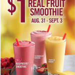 To celebrate Labor Day Burger King is offering $1 small fruit smoothies for the holiday weekend. This should be at all Burger King locations but I recommend calling your Burger King in advance just to make sure. You will be able to choose from their three flavors: Strawberry Banana Raspberry Tropical Mango No coupon is needed. … [Read more...]